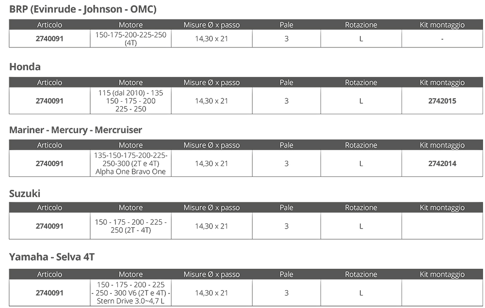 | 2740091 | Propeller amita oe 3 14,3 x 21 l | BRP (EVINRUDE - JOHNSON - OMC): 150-175-200-225-250 (4T) - HONDA: 115 (DAL 2010) - 135 - 150 - 175 - 200 - 225 - 250 - MARINER-MERCURY-MERCRUISER: 135-150-175-200-225-250-300 (2T E 4T)ALPHA ONE BRAVO ONE - SUZUKI: 150 - 175 - 200 - 225 - 250 (2T - 4T) - Y | 14,30 X 21 | HONDA: 2742015 - MARINER-MERCURY-MERCRUISER: 2742014 |