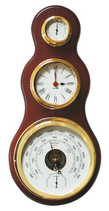 Autonautic DEG complete weather station which, starting from the top down, frames a hygrometer, a clock and a barometer / thermometer.