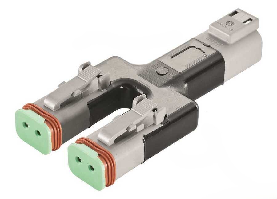 IP69K sealed snap-lock plug-in Y splitter connector designed for AC and DC marine electrical applications. Voltage 0-230V, max 14A, dimensions 40x88 mm.