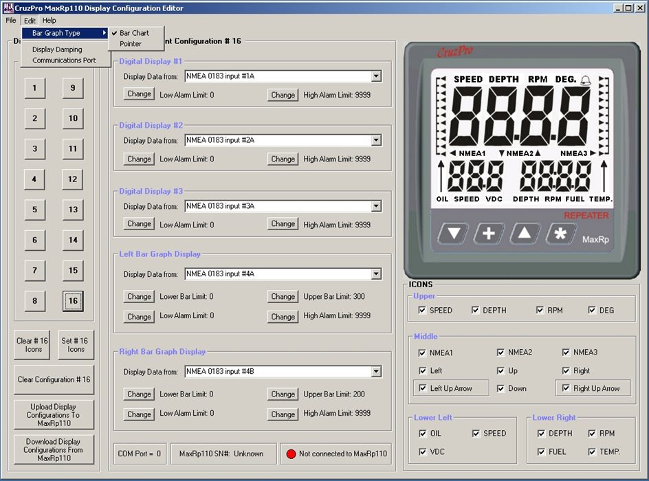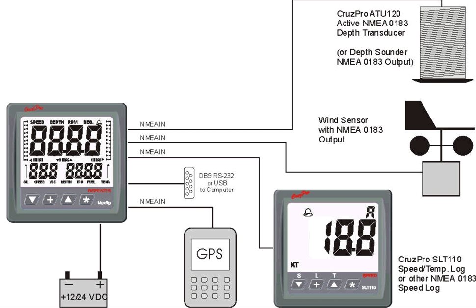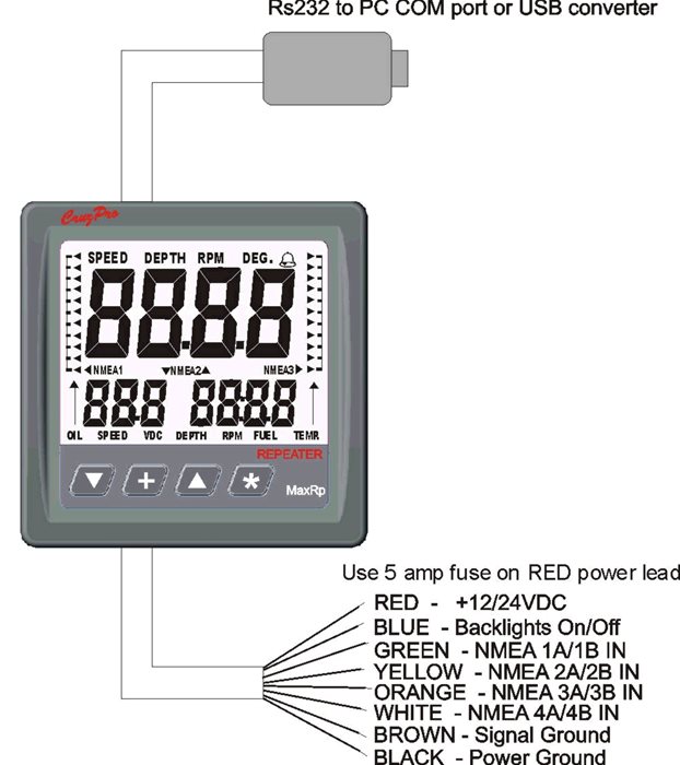 The CruzPro MaxRp110 is a programmable NMEA 0183 repeater with the ability to display over 5800 sentences. It is equipped with 4 data inputs and is able to receive 2 sentences for each input. It can display 3 data numerically and another 2 on lateral graduated scales. Allow to repeat data such as Depth, Speed, Water temperature, GPS Route to Waypoint, Distance to Waypoint, Wind Speed, Battery Voltage, Tank Levels, etc.