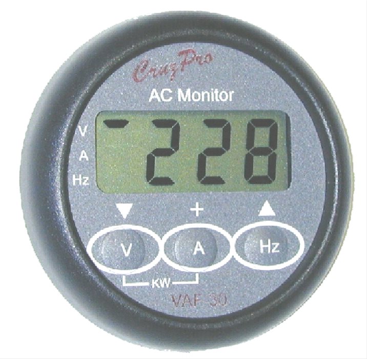 The VAF30 is a current analyzer for reading data relating to shore or generator current, such as Volts (from 90 to 300 VRMS), Amps (0-150 A), frequency (40-70 Hz) and kW (0-45 kW). It is possible to select an alarm for high and low voltage as well as for high and low frequency. When the alarm is activated the meter will sound an alarm at 85 dB while the display will flash.