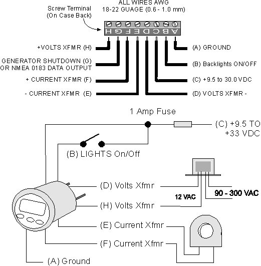 It is possible to use the external output for the automatic shutdown of the generator or to send NMEA 0183 data at 4800 bps for voltage, absorption, frequency and absorbed power. 5 levels of backlighting are selectable and all settings are saved in a permanent memory. It comes with both transformers for current and voltage reading.