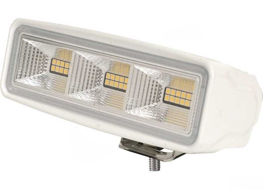 IP68 watertight cockpit and deck LED spreader flood light. White lacquered Aluminum alloy case, Stainless Steel bracket and Polycarbonate lenses. 10-30V voltage. Osram S5 LED 36 x 1W. 61120 lumens. 5700°K white light.
