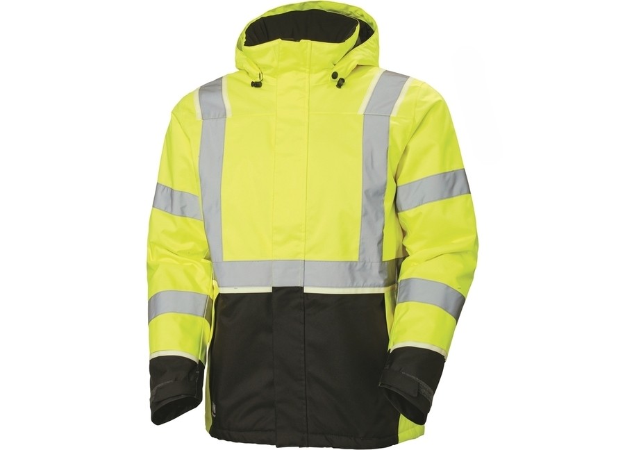 Helly Hansen UC-ME Winter Jacket that combines lightweight fabric, functional design and clever details for superior winter worksite performance. Waterproof yet breathable, with adjustable and detachable hood, no shoulder seams, padded collar, YKK® front zipper with chin protector, Napoleon pocket (no need to open the jacket to access), hand pockets with brushed lining and YKK® zipper, adjustable cuffs, articulated sleeves for optimal mobility, adjustable hem with elastic drawcord inside hand pocket and extended back for improved comfort. ISO EN 20471 certified for high visibility work wear.