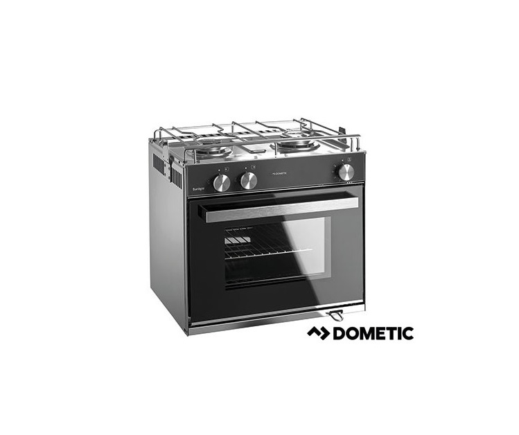 Compact gas stove with 2 burners and 28 L oven. Complete with pot holder, safety door lock and safe ignition system.