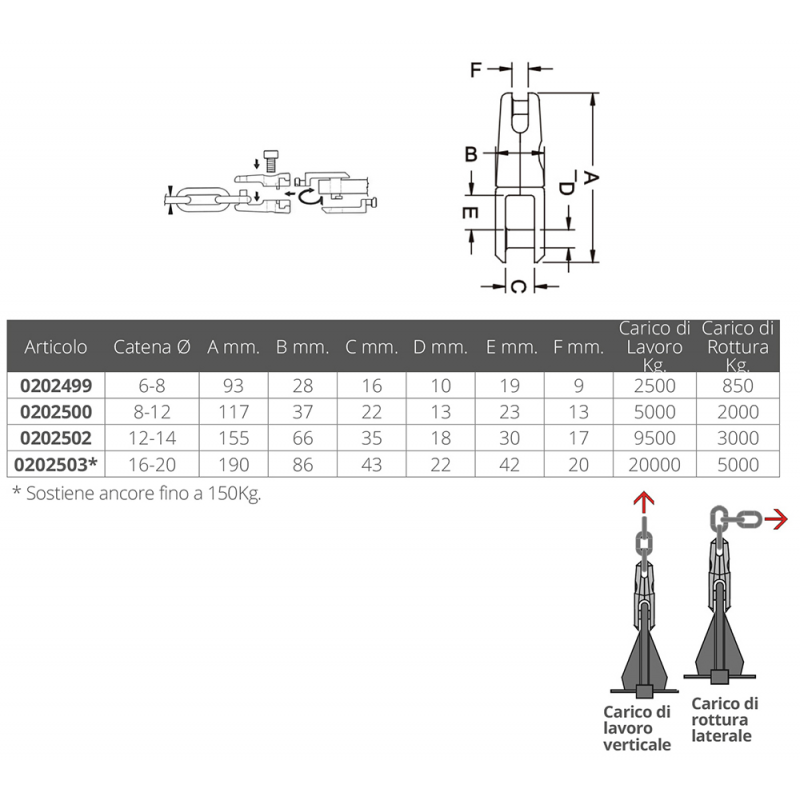 | Code | For chain D mm | A mm | B mm | C mm | D mm | And mm | F mm | Work load Kg | Breaking load Kg | Qt. | price | |