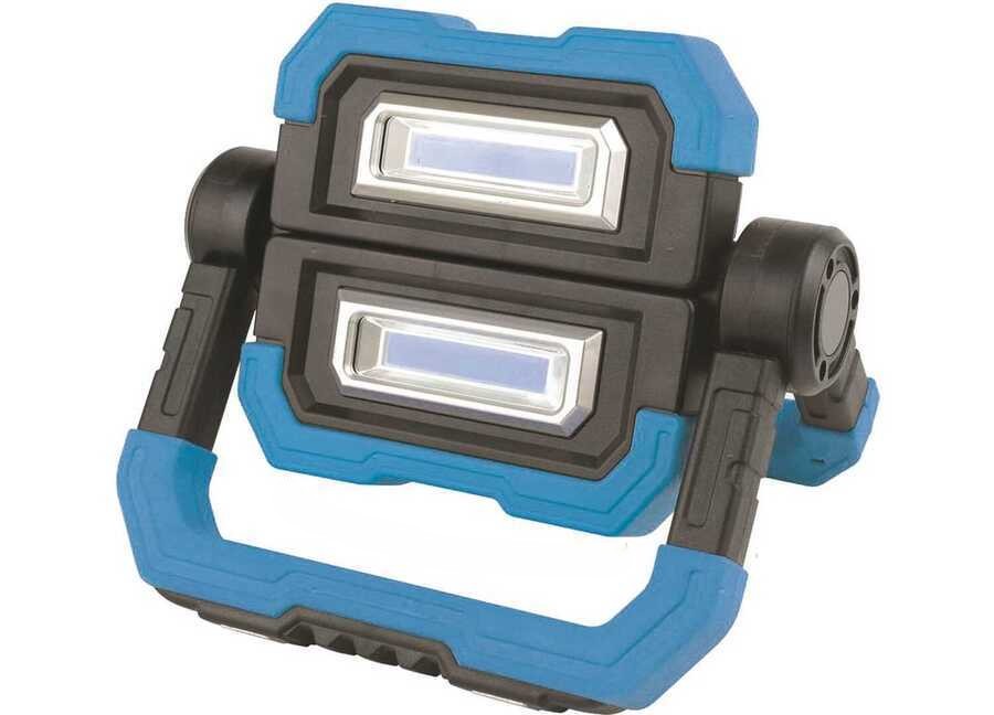 LED torch with Lithium battery rechargeable via USB socket. Reinforced ABS case on two folding elements with 360° rotating magnetic feet. It can be positioned anywhere and stored folded with minimal bulk. 10W LED with two intense/normal light modes with 4 hours of battery life in normal mode. Complete with USB cable and output for charging mobile devices.