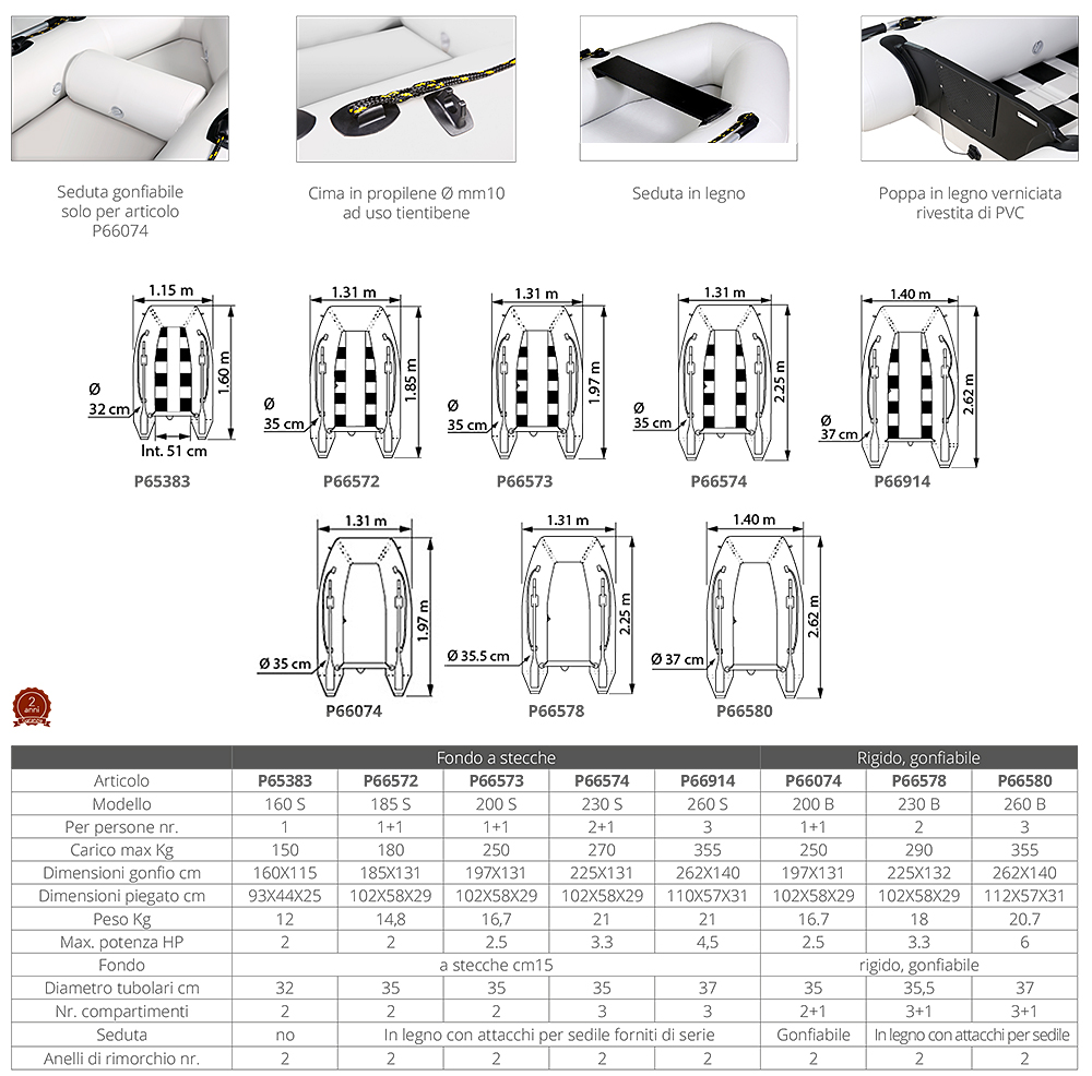 | Code | Title | Weight | Model | Size | Power | Max Load | Dimensions | No. People | Ø Tube | Floor | Nr. of air chambers | Seat |
